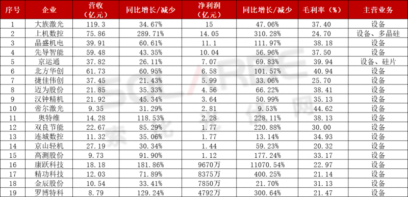 19家設(shè)備企業(yè)中,大族激光凈利潤(rùn)最高,前三季度實(shí)現(xiàn)營(yíng)收119.3億元,同比增長(zhǎng)34.67%,實(shí)現(xiàn)凈利潤(rùn)15億元,同比增長(zhǎng)47.06%。光伏方面,公司Q1-3光伏行業(yè)專用設(shè)備實(shí)現(xiàn)營(yíng)業(yè)收入8724.03萬,同比增長(zhǎng)42.80%,劃裂機(jī)、開膜摻雜機(jī)等設(shè)備形成批量銷售。