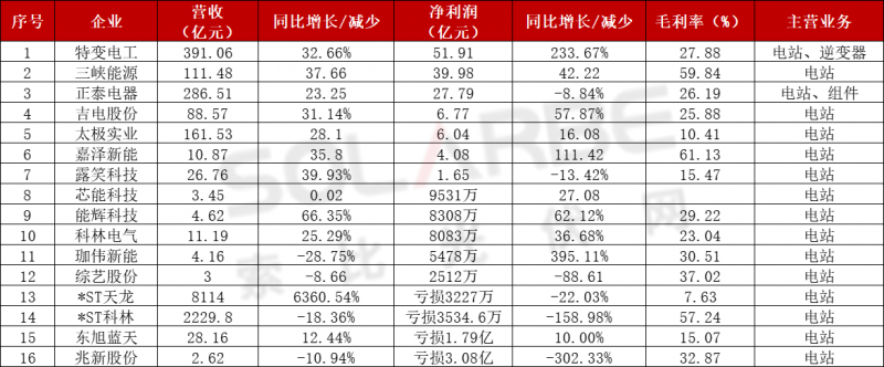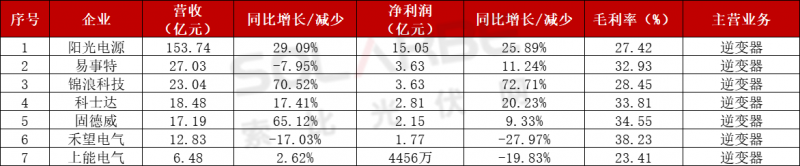 逆變器企業(yè)來看,7家逆變器企業(yè)Q1~Q3均實(shí)現(xiàn)盈利,2家企業(yè)凈利潤(rùn)同比去年同期下滑,其中禾望電氣毛利率達(dá)38.23%、固德威34.55%、科士達(dá)33.81%。