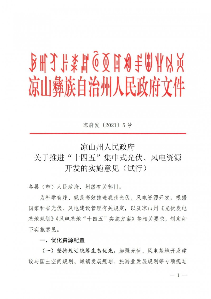 近日,涼山州人民政府發(fā)布《關(guān)于推進(jìn)“十四五”集中式光伏、 風(fēng)電資源開(kāi)發(fā)的實(shí)施意見(jiàn)(試行)》,意見(jiàn)提出: