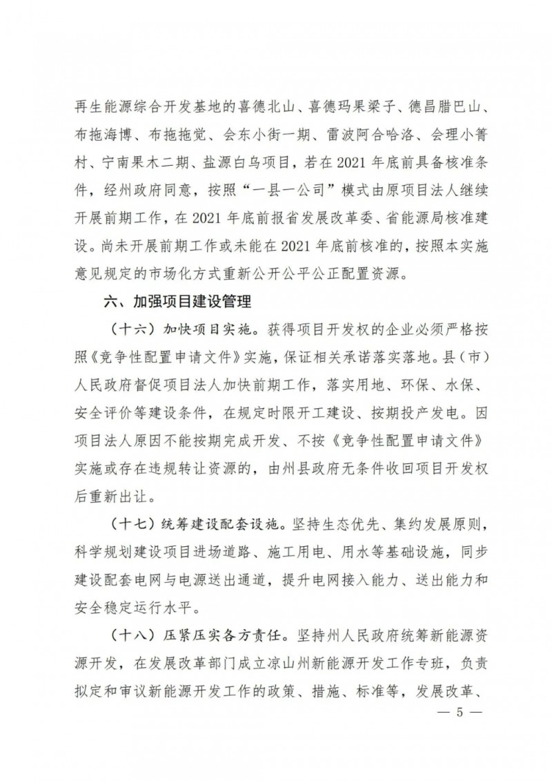 風(fēng)電項(xiàng)目。已列入2020 年省能源局核準(zhǔn)計(jì)劃和涼山州風(fēng)電基地規(guī)劃報(bào)告開(kāi)發(fā)時(shí)序或國(guó)家“十四五”風(fēng)光水一體化可再生能源綜合開(kāi)發(fā)基地的喜德北山、喜德瑪果梁子、德昌臘巴山、布拖海博、布拖拖覺(jué)、會(huì)東小街一期、雷波阿合哈洛、會(huì)理小箐村、寧南果木二期、鹽源白烏項(xiàng)目,若在2021 年底前具備核準(zhǔn)條 件,經(jīng)州政府同意,按照“一縣一公司”模式由原項(xiàng)目法人繼續(xù) 開(kāi)展前期工作,在 2021 年底前報(bào)省發(fā)展改革委、省能源局核準(zhǔn)建 設(shè)。尚未開(kāi)展前期工作或未能在2021年底前核準(zhǔn)的,按照本實(shí)施 意見(jiàn)規(guī)定的市場(chǎng)化方式重新公開(kāi)公平公正配置資源。