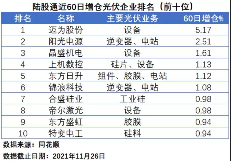 在陸股通近60日增倉排名中,邁為股份、陽光電源和晶盛機(jī)電分居前三位,增倉幅度分別為5.17%、2.51%和1.61%,其中邁為股份和晶盛機(jī)電均為光伏設(shè)備企業(yè),前者的核心產(chǎn)品為太陽能電池絲網(wǎng)印刷生產(chǎn)設(shè)備,后者主營產(chǎn)品為晶體生長設(shè)備。上機(jī)數(shù)控、東方日升、錦浪科技、合盛硅業(yè)、帝爾激光、東方盛虹和特變電工分居第四到第十位。前十名中,涉足光伏設(shè)備業(yè)務(wù)的企業(yè)高達(dá)4家,涉足電站業(yè)務(wù)的企業(yè)為3家。