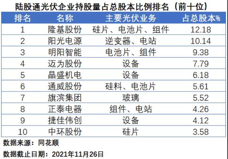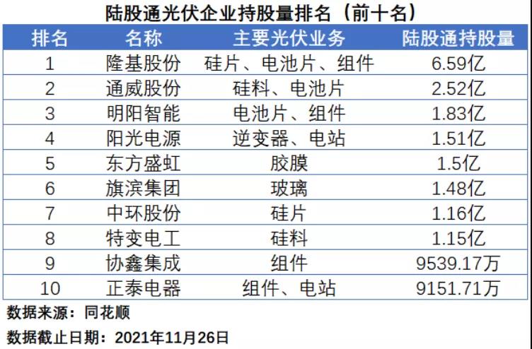 在陸股通持股量排名中,截止到11月26日收盤(下同),隆基股份憑借自身超強(qiáng)的綜合實(shí)力以及較高的總股本規(guī)模最受“北向資金”的青睞,以6.59億的持股量位居第一,通威股份和明陽智能分別以2.52億和1.83億位居第二和第三。陽光電源、東方盛虹、旗濱集團(tuán)、中環(huán)股份、特變電工的持股量均在1億股以上。在前十名中,共有4家企業(yè)涉足組件業(yè)務(wù),3家企業(yè)涉足電池片業(yè)務(wù),涉足硅料、硅片業(yè)務(wù)的企業(yè)各有2家。