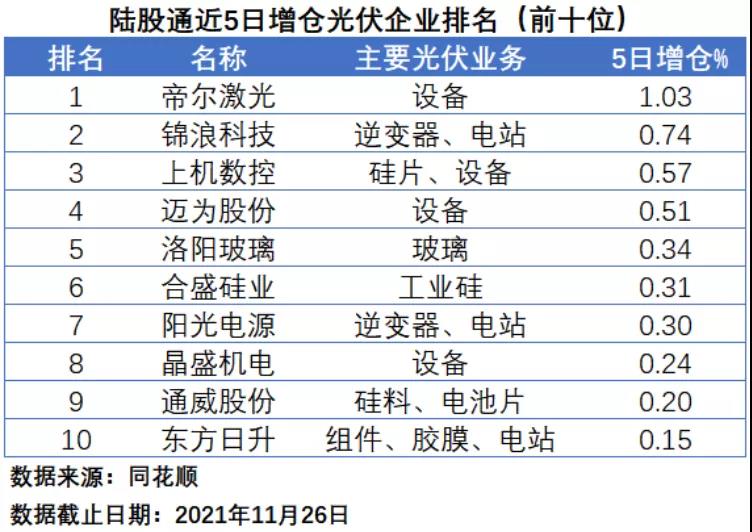 在陸股通近5日增倉排名中,電池片生產(chǎn)設(shè)備廠商帝爾激光最受“北向資金”追捧,以1.03%的增持幅度排名第一,錦浪科技、上機(jī)數(shù)控以0.74%和0.57%位居第二和第三,邁為股份、洛陽玻璃、合盛硅業(yè)、陽光電源、晶盛機(jī)電、通威股份和東方日升位居第四到第十位。前十名中,涉足光伏設(shè)備領(lǐng)域的企業(yè)數(shù)量依然為最多,達(dá)到了4家。