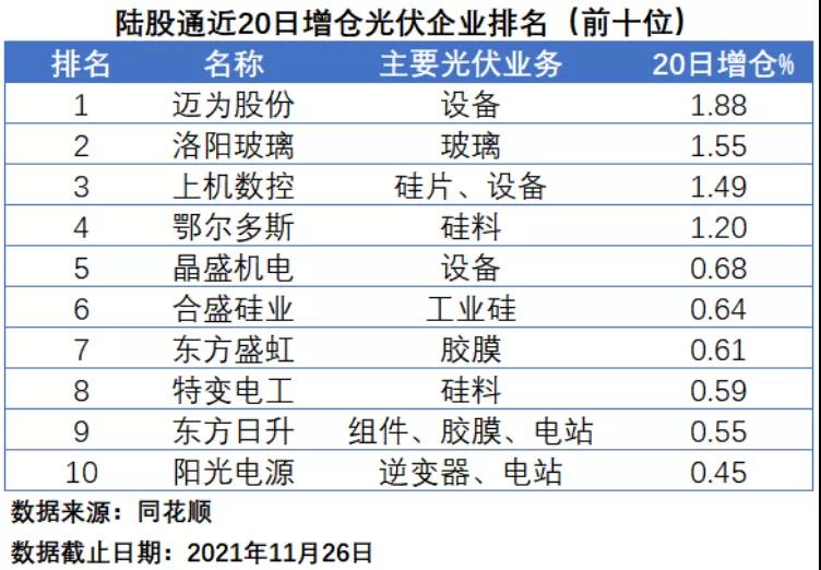 在陸股通近20日增倉排名中,邁為股份、洛陽玻璃和上機(jī)數(shù)控位居前三位,增持幅度分別為1.88%、1.55%和1.45%,值得一提的是,洛陽玻璃于11月26日正式發(fā)布了產(chǎn)能擴(kuò)建計(jì)劃,未來公司在光伏玻璃領(lǐng)域的市場地位將進(jìn)一步得到鞏固;上機(jī)數(shù)控此前三季報(bào)業(yè)績不及預(yù)期,股價(jià)大跌,而“北向資金”則選擇了逆勢抄底。排名第四到第十位的企業(yè)分別為鄂爾多斯、晶盛機(jī)電、合盛硅業(yè)、東方盛虹、特變電工、東方日升和陽光電源。