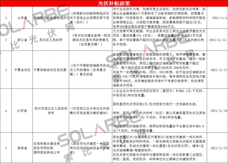 白駒過隙、時(shí)光荏苒,走過11月份,全年已接近尾聲。光伏政策在11月份集中爆發(fā),據(jù)索比光伏網(wǎng)不完全統(tǒng)計(jì),總共高達(dá)83條(國家21、地方62條)涉及24個(gè)省市地區(qū),包含國家政策、光伏項(xiàng)目、分布式光伏、光伏補(bǔ)貼、雙碳目標(biāo)、“十四五”規(guī)劃電力市場、整縣等其他相關(guān)政策。