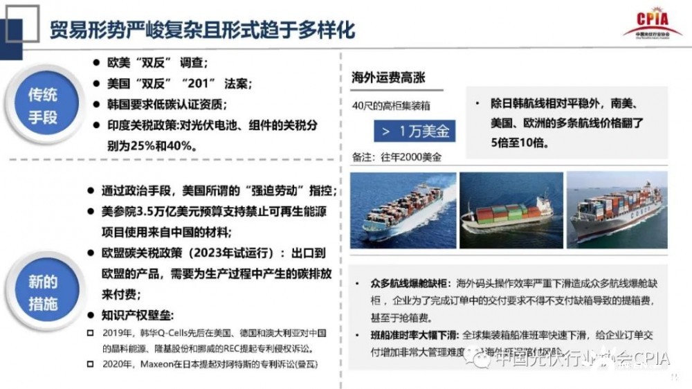 在海外市場(chǎng)中,由于中國六成以上的產(chǎn)品需要出口,而海外市場(chǎng)中貿(mào)易形式嚴(yán)峻復(fù)雜且形式趨于多樣化。如歐美“雙反”調(diào)查、美國“雙反”“201”法案等。同時(shí)海外運(yùn)費(fèi)高漲,除日韓航線相對(duì)平穩(wěn)外,南美、美國、歐洲的多條航線價(jià)格翻了5倍至10倍。