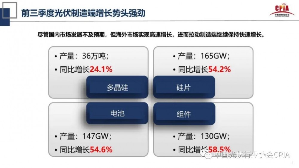在此次會(huì)議上,王勃華對(duì)光伏行業(yè)的發(fā)展情況做了詳細(xì)介紹。在光伏制造端方面,他指出,2021年前三季度光伏制造端增長(zhǎng)勢(shì)頭強(qiáng)勁,在光伏制造端四個(gè)環(huán)節(jié)中,多晶硅產(chǎn)量為36萬噸,同比增長(zhǎng)24.1%;硅片產(chǎn)量為165GW,同比增長(zhǎng)54.2%;電池產(chǎn)量為147GW,同比增長(zhǎng)54.6%;組件產(chǎn)量為130GW,同比增長(zhǎng)58.5%。他表示,盡管國內(nèi)市場(chǎng)發(fā)展不及預(yù)期,但海外市場(chǎng)實(shí)現(xiàn)了高速增長(zhǎng),進(jìn)而拉動(dòng)光伏制造端繼續(xù)保持快速增長(zhǎng)。因此,光伏制造端在今年仍處于快速發(fā)展中。