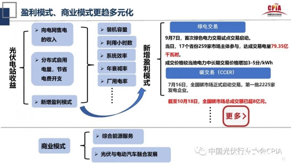 王勃華還指出,未來分布式光伏將迎來規(guī)?;l(fā)展的市場(chǎng)空間。究其原因是,第一,國家、地方政策的支持,以央企為梯隊(duì),地方國有企業(yè)和跨界能源巨頭企業(yè)為代表紛紛進(jìn)入分布式市場(chǎng)。第二,光伏盈利模式、商業(yè)模式的多元化。盈利上光伏電站收益新增綠電交易和碳交易(CCER)等盈利模式,商業(yè)模式方面是綜合能源服務(wù)和光伏與電動(dòng)汽車融合發(fā)展。