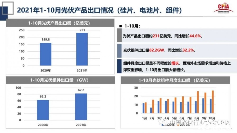 對(duì)其增長(zhǎng)的原因,王勃華分析稱:“其一是組件月度出口額量不同程度的增長(zhǎng),1-10月光伏組件出口量為82.2GW,同比增長(zhǎng)了32.2%,根據(jù)往年數(shù)據(jù)對(duì)比,組件每月出口數(shù)據(jù)都有超過去年。其二是受海外市場(chǎng)需求增加和價(jià)格上浮雙重影響,1-10月光伏產(chǎn)品出口額呈現(xiàn)大幅增長(zhǎng)趨勢(shì)。”