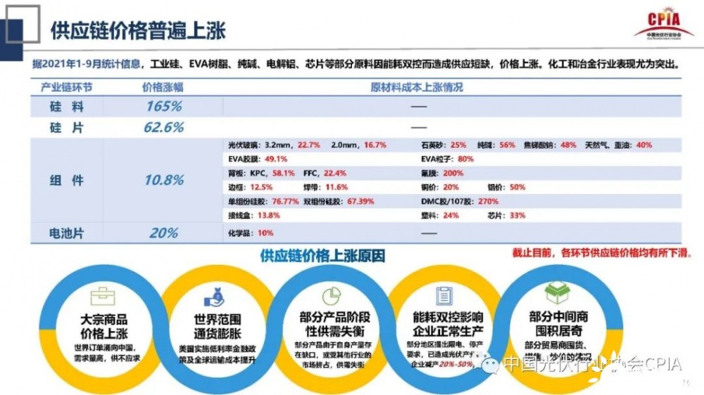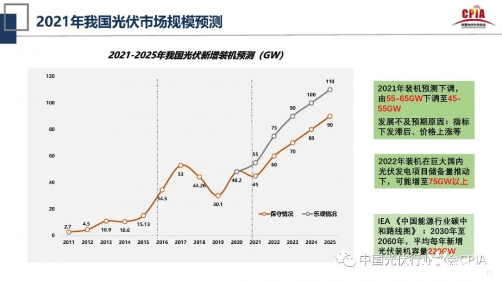 據(jù)此,王勃華表示,供應(yīng)鏈價(jià)格的上漲尤其會(huì)影響到光伏裝機(jī)的預(yù)測(cè)。他說:“今年光伏裝機(jī)量預(yù)測(cè)要下調(diào),由原來的55-65GW下調(diào)至45-55GW,發(fā)展不及預(yù)期的原因?yàn)橹笜?biāo)下發(fā)滯后、價(jià)格上漲等所致。但是2022年光伏裝機(jī)在國內(nèi)巨大的光伏發(fā)電項(xiàng)目?jī)?chǔ)備量推動(dòng)下,可能會(huì)增至75GW以上。”