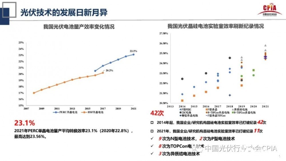 在光伏技術(shù)方面,王勃華形容其為“日新月異”。特別在轉(zhuǎn)換效率方面,2021年我國PERC單晶電池量平均轉(zhuǎn)換效率達(dá)23.1%,最高達(dá)到23.56%。而2020年僅有22.8%。在光伏晶硅電池實(shí)驗(yàn)室效率方面,從2014年起至今8年時(shí)間,我國企業(yè)/研究機(jī)構(gòu)晶硅電池實(shí)驗(yàn)室效率已打破紀(jì)錄42次,2021年,我國企業(yè)/研究機(jī)構(gòu)晶硅電池實(shí)驗(yàn)室效率已打破紀(jì)錄11次。其中,9次為N型電池技術(shù),2次為P型電池技術(shù),8次為TOPCon電池技術(shù),3次為異質(zhì)結(jié)電池技術(shù)。