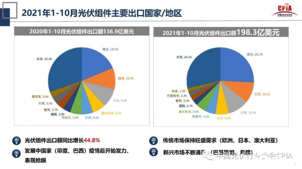緊接著,王勃華對(duì)2020年和2021年光伏組件主要出口國家/地區(qū)做了介紹。2021年1-10月光伏組件出口額為198.3億美元,其中,歐洲、日本、澳大利亞等傳統(tǒng)市場(chǎng)國家保持旺盛需求,巴基斯坦、希臘等新興市場(chǎng)也不斷涌現(xiàn)出來。對(duì)比2020年,2020年1-10月光伏組件出口額為136.9億美元,同比增長(zhǎng)44.8%,其中,印度、巴西等發(fā)展中國家在疫情后開始發(fā)力,表現(xiàn)十分搶眼。