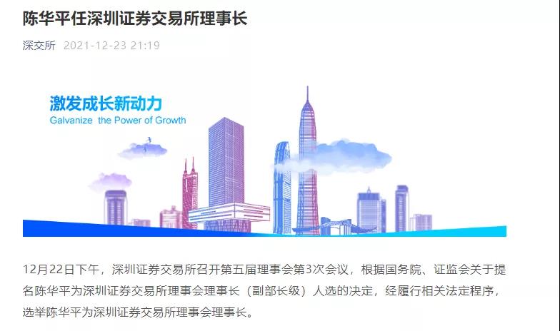 深交所消息,12月22日下午,深圳證券交易所召開第五屆理事會第3次會議,根據(jù)國務院、證監(jiān)會關(guān)于提名陳華平為深圳證券交易所理事會理事長(副部長級)人選的決定,經(jīng)履行相關(guān)法定程序,選舉陳華平為深圳證券交易所理事會理事長。