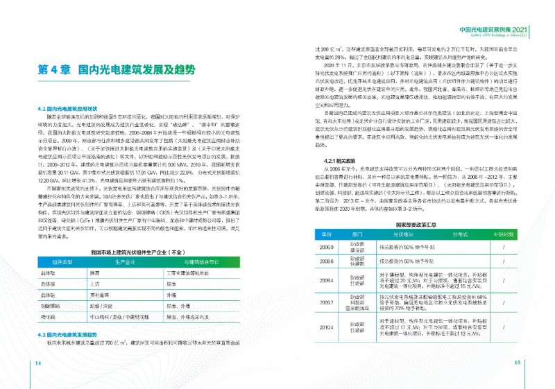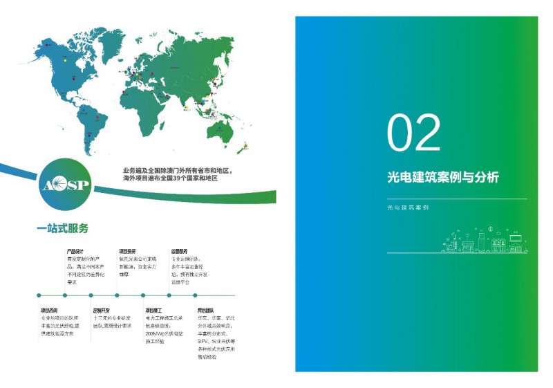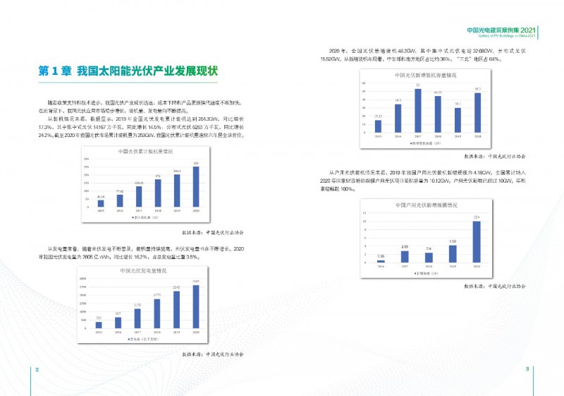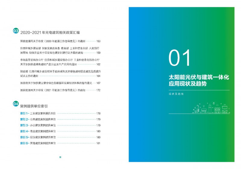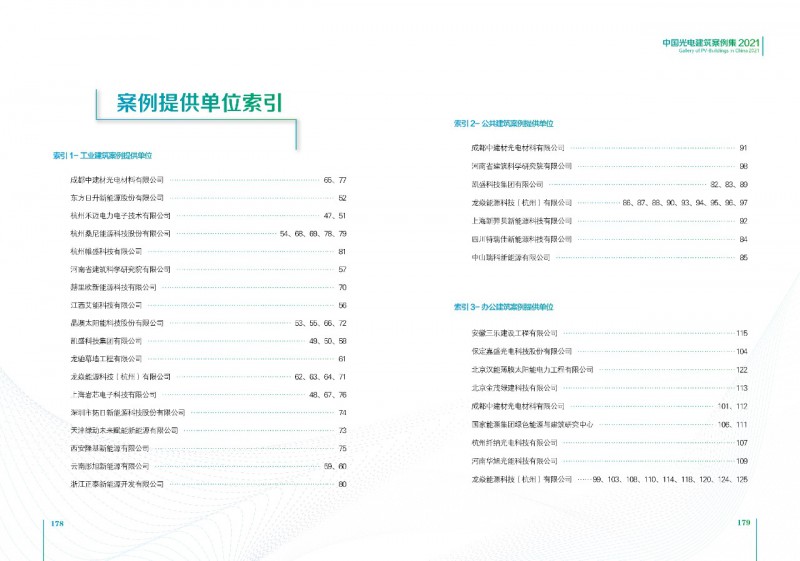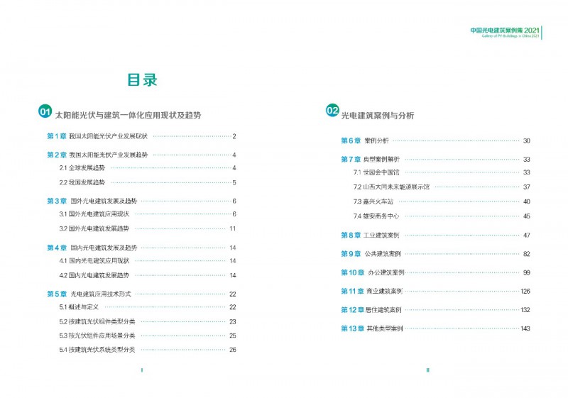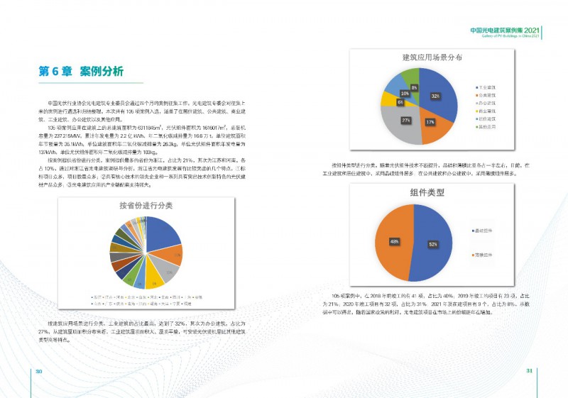 《案例集》分析和總結(jié)我國光電建筑應(yīng)用現(xiàn)狀、國內(nèi)外發(fā)展趨勢、技術(shù)要點等內(nèi)容,為行業(yè)發(fā)展提供基礎(chǔ)數(shù)據(jù)。經(jīng)過案例篩選,共收錄了105項光電建筑典型案例,涵蓋了我國工業(yè)建筑、公共建筑、辦公建筑、商業(yè)建筑、居住建筑及其他建筑類型光伏應(yīng)用,為光伏在建筑上大規(guī)模應(yīng)用提供了依據(jù)和參考價值。