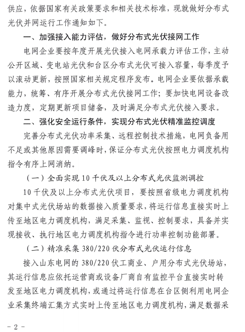 近日,國家能源局山東監(jiān)管辦公室 山東省能源局發(fā)布關(guān)于切實(shí)做好分布式光伏并網(wǎng)運(yùn)行工作的通知,通知指出四點(diǎn),一、加強(qiáng)接入能力評估,做好分布式光伏接網(wǎng)工作;二、強(qiáng)化安全運(yùn)行條件,實(shí)現(xiàn)分布式光伏精準(zhǔn)監(jiān)控調(diào)度;三、規(guī)范涉網(wǎng)技術(shù)參數(shù),保證分布式光伏并網(wǎng)性能;四、加強(qiáng)協(xié)同聯(lián)動(dòng),強(qiáng)化監(jiān)督考核。