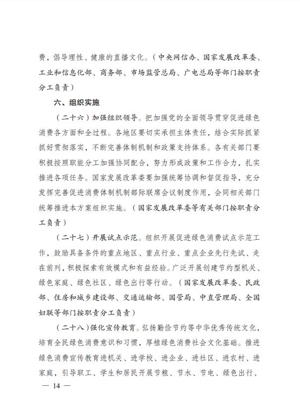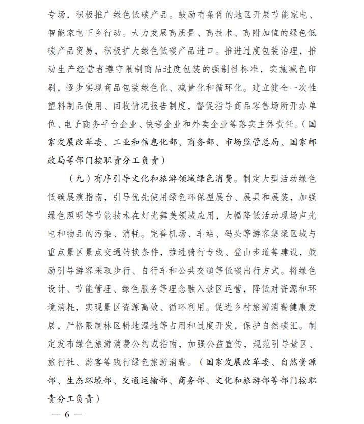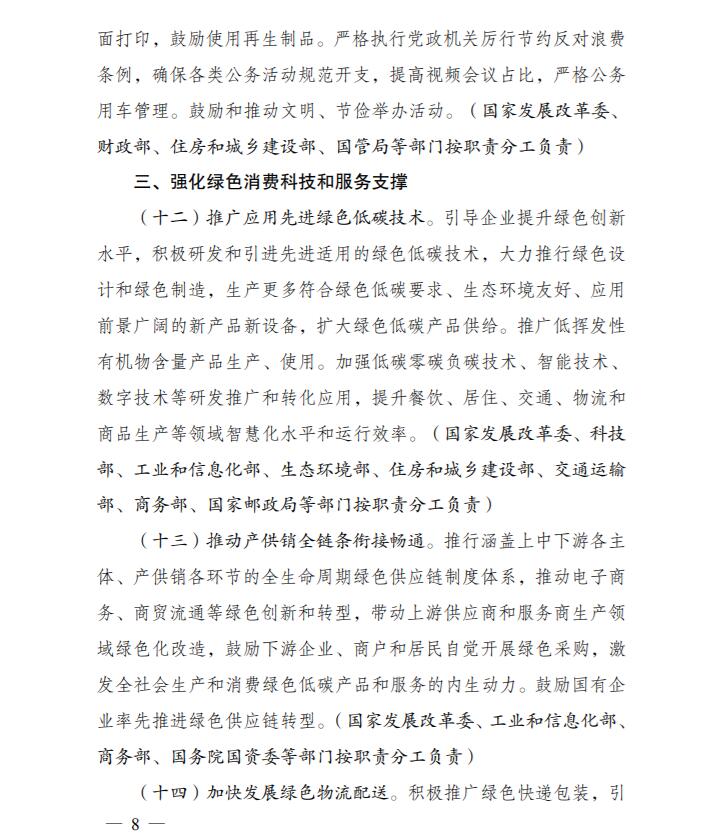 為深入貫徹落實《中共中央、國務(wù)院關(guān)于完整準(zhǔn)確全面貫徹新發(fā)展理念做好碳達峰碳中和工作的意見》和《2030年前碳達峰行動方案》有關(guān)要求,根據(jù)碳達峰碳中和工作領(lǐng)導(dǎo)小組部署安排,國家發(fā)展改革委、工業(yè)和信息化部、住房和城鄉(xiāng)建設(shè)部、商務(wù)部、市場監(jiān)管總局、國管局、中直管理局會同有關(guān)部門研究制定了《促進綠色消費實施方案》?,F(xiàn)印發(fā)給你們,請結(jié)合實際,認(rèn)真抓好貫徹落實。