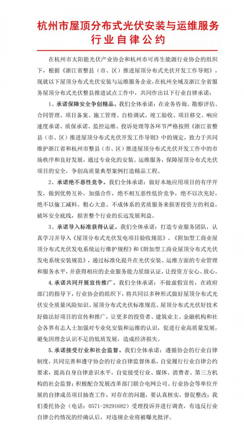 為踐行該《導則》在杭州全域及浙江全省的推廣應用,在杭州市太陽能光伏產(chǎn)業(yè)協(xié)會和杭州市可再生能源行業(yè)協(xié)會的組織下,浙江正泰新能源開發(fā)有限公司、龍焱能源科技(杭州)有限公司、杭州桑尼能源科技股份有限公司、杭州福斯特光伏發(fā)電有限公司、杭州帷盛科技有限公司、德鄰聯(lián)合工程有限公司、浙江交投新能源投資有限公司、浙江天裕能源有限公司、浙江維旺合縱能源科技有限公司、杭州城市能源有限公司、泛太能源環(huán)境(浙江)有限公司、浙江寰泰新能源有限公司、浙江拓華能源科技有限公司、潔云電力工程(杭州)有限公司、杭州眾能光電科技有限公司共十五家光伏企業(yè),根據(jù)《導則》條款,聯(lián)合簽署了《杭州市屋頂分布式光伏安裝與運維服務(wù)行業(yè)自律公約》,帶頭向社會公開承諾加強行業(yè)自律,共同維護浙江省和杭州市整縣(市、區(qū))推進屋頂分布式光伏開發(fā)工作中的市場秩序和良好發(fā)展。