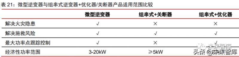 微型逆變器是小型、組件級分布式發(fā)電系統(tǒng)電能轉(zhuǎn)換的最佳方案。“組件級電力電子” 解決方案除了包括微型逆變器,還有“組串式逆變器+優(yōu)化器/關(guān)斷器”的方案。優(yōu)化器或 關(guān)斷器可為光伏系統(tǒng)提供組件級的關(guān)斷能力,在特定場景下保證光伏系統(tǒng)直流電壓不超過 80V,且優(yōu)化器亦可實現(xiàn)組件級的最大功率點跟蹤控制;但在運行過程中系統(tǒng)仍存在直流 高壓,有一定的安全隱患。組串式逆變器+優(yōu)化器/關(guān)斷器在較大功率的應用場景中有一定 的成本優(yōu)勢,但微型逆變器在中小功率等級的應用場景中更優(yōu)。