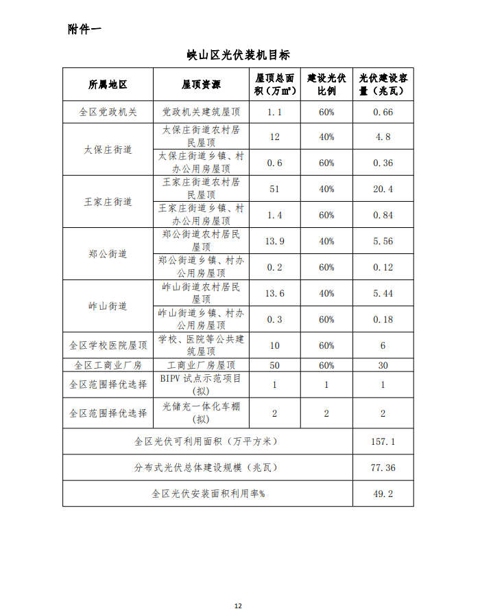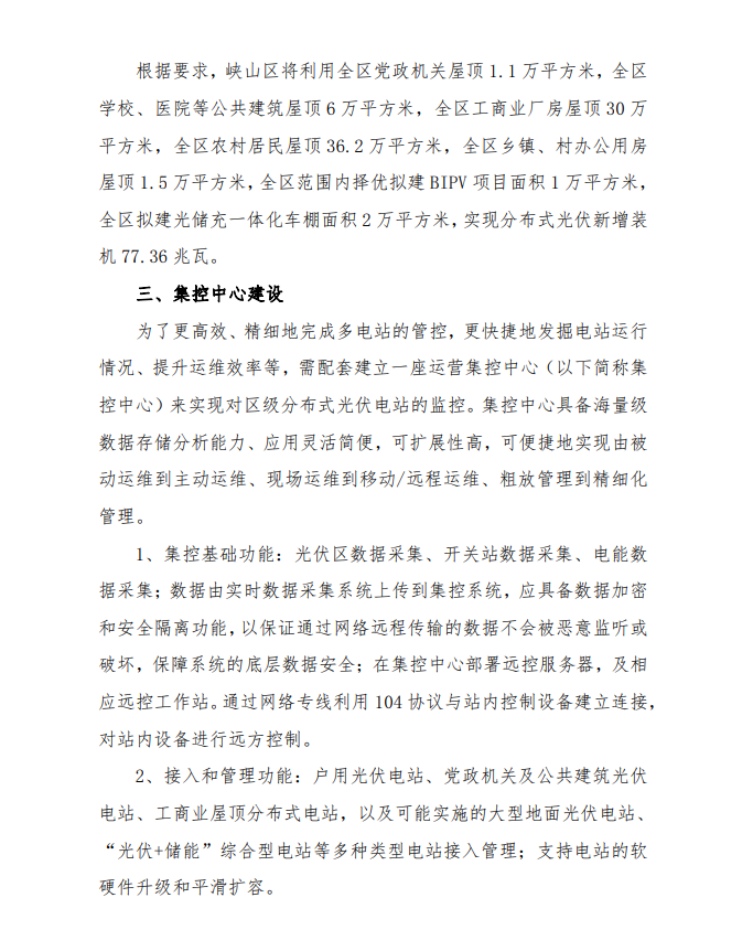 為深入貫徹落實(shí)鄉(xiāng)村振興戰(zhàn)略,努力實(shí)現(xiàn)國(guó)家碳達(dá)峰、碳中和戰(zhàn)略任務(wù),統(tǒng)籌推進(jìn)“源網(wǎng)荷儲(chǔ)-智慧協(xié)同”的分布式光伏建設(shè),打造全國(guó)“雙碳”示范區(qū),根據(jù)峽山區(qū)本地光照條件和屋頂資源情況,結(jié)合國(guó)家能源局政策要求,峽山區(qū)將利用全區(qū)黨政機(jī)關(guān)屋頂 1.1 萬(wàn)平方米,全區(qū)學(xué)校、醫(yī)院等公共建筑屋頂 6 萬(wàn)平方米,全區(qū)工商業(yè)廠房屋頂 30 萬(wàn)平方米,全區(qū)農(nóng)村居民屋頂36.2 萬(wàn)平方米,全區(qū)鄉(xiāng)鎮(zhèn)、村辦公用房屋頂 1.5 萬(wàn)平方米,全區(qū)范圍內(nèi)擇優(yōu)擬建 BIPV 項(xiàng)目面積 1 萬(wàn)平方米,全區(qū)擬建光儲(chǔ)充一體化車(chē)棚面積 2 萬(wàn)平方米,實(shí)現(xiàn)分布式光伏新增裝機(jī) 77.36 兆瓦。