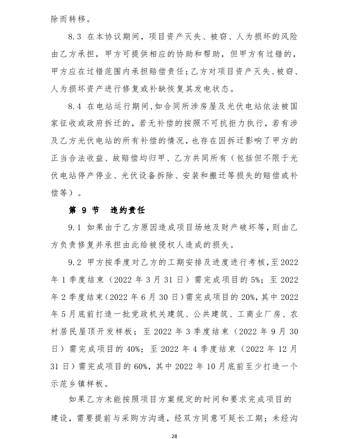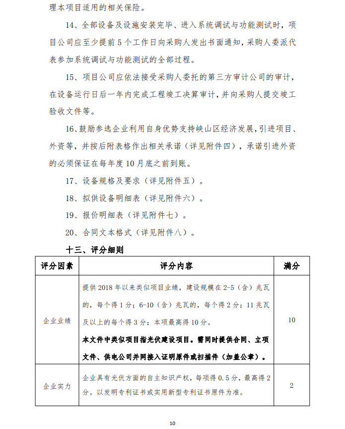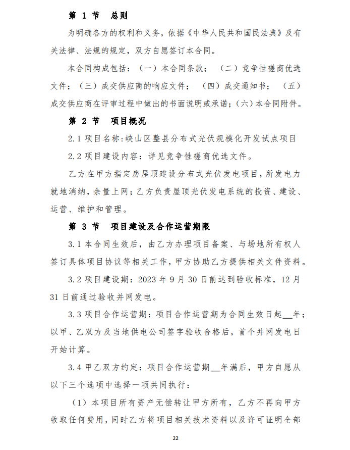 2月9日,山東濰坊峽山區(qū)發(fā)布整縣分布式光伏規(guī)?;_(kāi)發(fā)試點(diǎn)項(xiàng)目競(jìng)爭(zhēng)性磋商二次公告,要求2023 年 9 月 30 日完成驗(yàn)收合格并網(wǎng)發(fā)電,按所屬區(qū)域完成情況分批次驗(yàn)收(至 2022 年 12 月底至少完成50%)。由項(xiàng)目公司向電網(wǎng)公司提出并網(wǎng)驗(yàn)收和調(diào)試申請(qǐng),辦理備案與接入手續(xù),完成并網(wǎng)驗(yàn)收及調(diào)試,實(shí)現(xiàn)項(xiàng)目并網(wǎng)運(yùn)行。至 2023 年底,光伏項(xiàng)目總投資約 4.0946 億元人民幣。