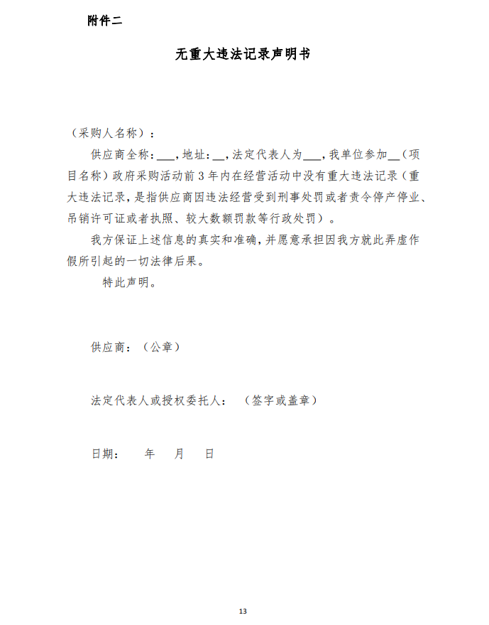 5、參與磋商的企業(yè)在參與政府采購(gòu)項(xiàng)目3年內(nèi)在經(jīng)營(yíng)活動(dòng)中無(wú)違法記錄的書(shū)面聲明(詳見(jiàn)附件)。
