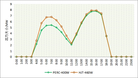由于組件正面朝西,背面朝東,上午時刻,組件背面接收輻射,由于異質(zhì)結組件的雙面率較高,因此總體出力大小高于PERC組件。到了下午,太陽照射在組件的正面,雖然背面的輻射接收量較小,但是異質(zhì)結組件的出力大小仍略高于PERC組件。