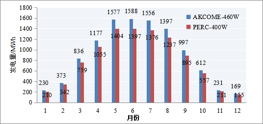 根據(jù)模擬結果,PERC400W組件及異質(zhì)結460W雙面組件的首年月份發(fā)電對比結果如圖2所示,在3月至9月,異質(zhì)結組件的發(fā)電提升較為明顯,而在10月至次年2月,差異較小。