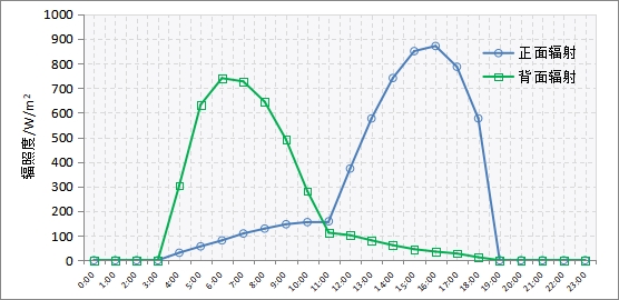 圖3為典型日的正面背面輻照度比較,輻照度大小與太陽的方位有關。上午時刻,太陽的方位位于東面,組件背面主要接收直接輻射、地面的反射和大氣中的散射輻射,組件正面主要接收大氣中的散射輻射和地面的一部分反射輻射,而到了下午正好相反。