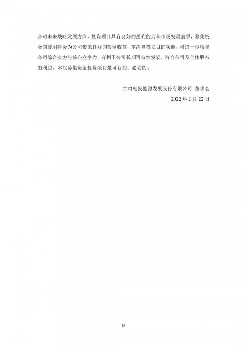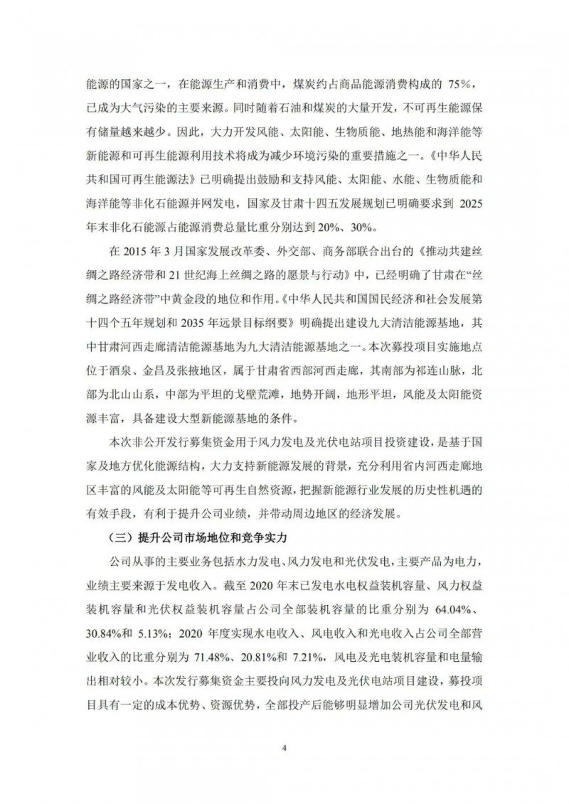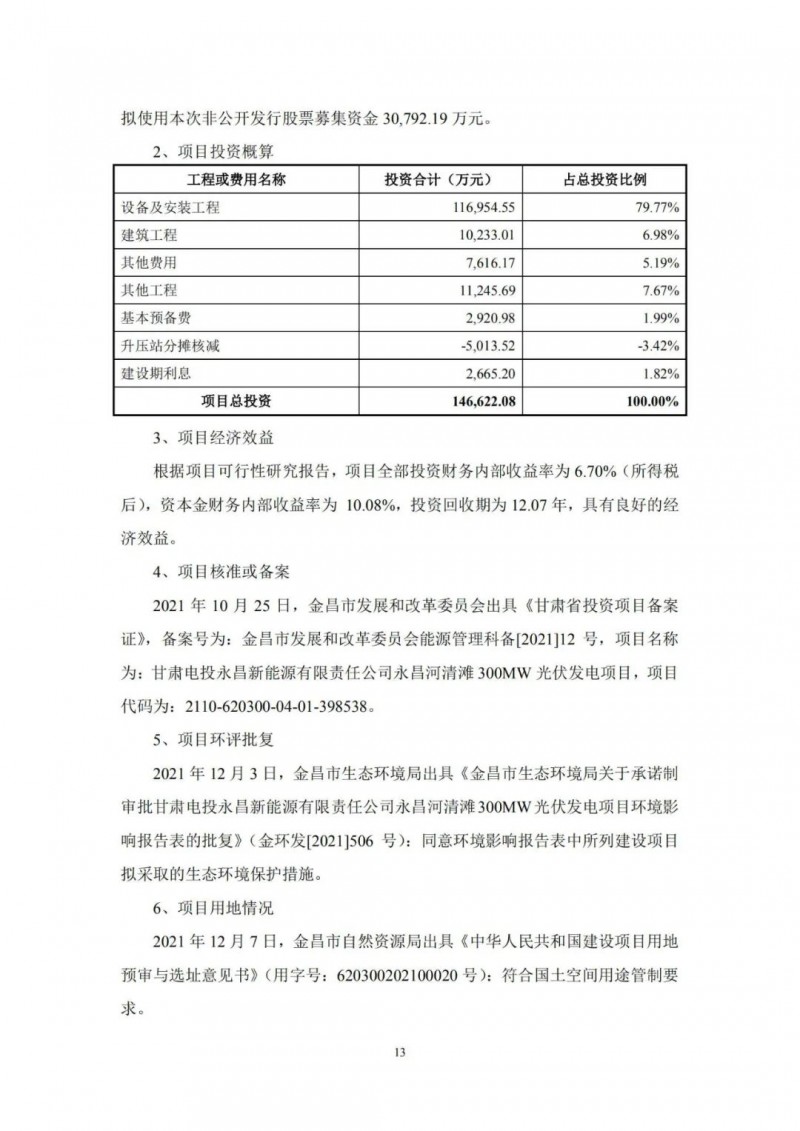 2月21日,甘肅電投發(fā)布公告,擬定增募資不超過12億元,用于玉門市麻黃灘第一風(fēng)電場C區(qū)200兆瓦項目、瓜州干河口200MW光伏項目、永昌河清灘300MW光伏發(fā)電項目、高臺縣鹽池灘100MW風(fēng)電場項目及補充流動資金。天眼查app顯示,公司是于1997年7月8日經(jīng)甘肅省人民政府甘政函[1997]36號文件批準,由西北油漆廠獨家發(fā)起,部分改制,采用募集設(shè)立方式設(shè)立的股份有限公司。公司1997年8月29日向社會公眾公開發(fā)行4500萬股人民幣普通股,并于1997年9月23在甘肅省工商行政管理局登記注冊。1997年10月14日經(jīng)中國證券監(jiān)督管理委員會批準,公司股票在深圳證券交易所上市交易。自2012年12月21日起,公司名稱由"西北永新化工股份有限公司"變更為"甘肅電投能源發(fā)展股份有限公司"。