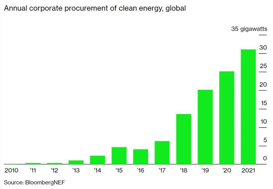 2021年有 67 家公司加入了 RE100(100%可再生能源倡議),總計(jì)有 355 家公司承諾使用 100% 可再生能源。2021年全球企業(yè)采購(gòu)可再生能源合同的容量創(chuàng)下了 31GW 的新紀(jì)錄。其中大部分產(chǎn)能是在美洲采購(gòu)的,其中 17GW 來自美國(guó)的企業(yè),3.3GW 來自北美和南美的其他國(guó)家的企業(yè)。