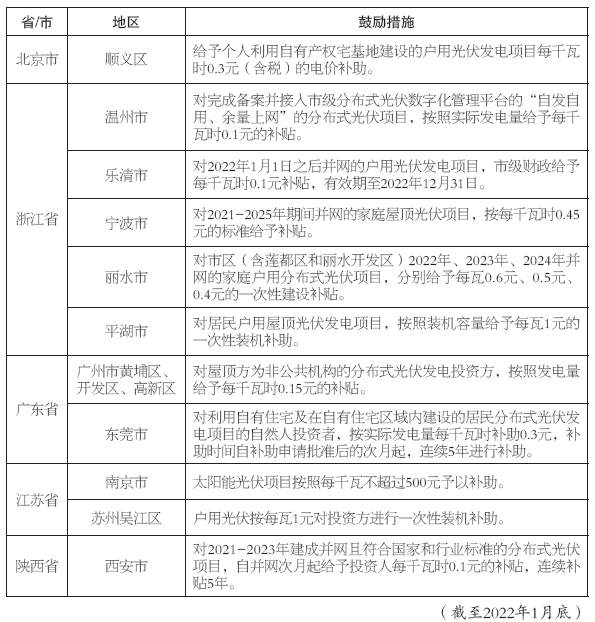 2022年新建項目國家補貼政策還未明確,戶用光伏平價上網(wǎng)已被業(yè)內(nèi)認為是大勢所趨。據(jù)不完全統(tǒng)計,截至2022年1月底,已有北京、浙江、江蘇等省(市)的二十多個地區(qū)提出了分布式光伏新增項目電價補貼、補助或獎勵政策,部分地區(qū)還為戶用光伏項目設(shè)置了專項補貼,以期吸引更多社會資本進入當(dāng)?shù)貞粲霉夥袌觥?/p>