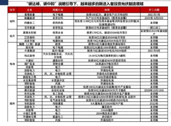 近年來(lái)光伏產(chǎn)業(yè)發(fā)展迅速,疫情、產(chǎn)業(yè)鏈漲價(jià)等因素下仍屢創(chuàng)新高,跨界入局者屢見不鮮,成功者也不在少數(shù),前有華為的逆變器、比亞迪的組件,后有高景的硅片、金陽(yáng)新能源的異質(zhì)結(jié),吉利、順豐、長(zhǎng)城、同德化工、海螺水泥、和邦生物等實(shí)力玩家也紛紛入場(chǎng)。