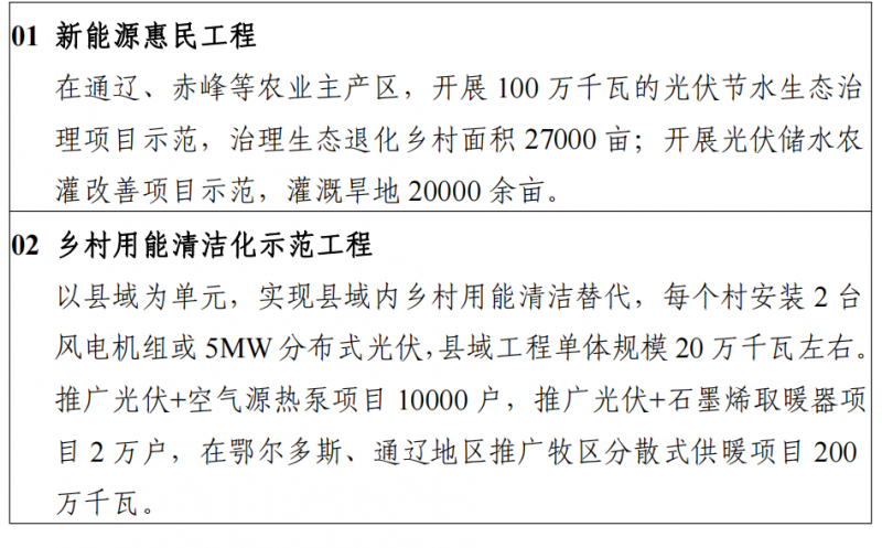 五、加快推動農(nóng)村能源革命助力鄉(xiāng)村振興新能源惠民工程。開展農(nóng)網(wǎng)鞏固提升工程,與提升風電、光伏等分布式電能就近接入有機結合,提升鄉(xiāng)村電氣化水平,提高農(nóng)電服務水平,推進農(nóng)網(wǎng)智能化。在電網(wǎng)基礎建設薄弱且用電負荷分散度較高的偏遠末端配電網(wǎng)、農(nóng)區(qū)牧區(qū)等地區(qū),因地制宜推動風電、光伏開發(fā)。在通遼、赤峰等盟市, 開展光伏儲水農(nóng)灌改善工程和光伏節(jié)水生態(tài)治理工程示范, 提升電網(wǎng)農(nóng)灌期供電可靠性,構建新型節(jié)水灌溉系統(tǒng),有效實現(xiàn)節(jié)水節(jié)能、生態(tài)恢復治理。自治區(qū)鄉(xiāng)村人口約 960 萬人,開展 100 萬千瓦新能源惠民工程,滿足農(nóng)村牧區(qū)清潔用能需求。鄉(xiāng)村用能清潔化示范工程。推動鄉(xiāng)村產(chǎn)業(yè)、農(nóng)業(yè)生產(chǎn)和農(nóng)村生活用能清潔化,以分布式光伏、分散式風電、地熱能利用為核心,開展智慧用能大棚、清潔供暖、綠色出行等智慧用能示范。加快提升呼包鄂周邊、蒙東鄉(xiāng)村可再生能源供暖水平,合理配比分散式風電和分布式光伏,利用電熱膜、電鍋爐、空氣源熱泵、石墨烯取暖器等供暖設施,形成清潔能源支持產(chǎn)業(yè)發(fā)展、產(chǎn)業(yè)發(fā)展助力鄉(xiāng)村振興的農(nóng)村安居環(huán) 境。在通遼、鄂爾多斯等農(nóng)牧區(qū),開展牧區(qū)清潔供暖示范項目,探索離網(wǎng)式新能源供電供熱模式,滿足農(nóng)村牧區(qū)清潔用能需求。在蒙東地區(qū)人口密集的旗縣,充分利用當?shù)亟斩捹Y源開展生物質(zhì)發(fā)電供暖示范,實現(xiàn)旗縣區(qū)域生物質(zhì)供暖規(guī)?;娲嵘稍偕茉聪M占比,推廣生物質(zhì)碳化與固化及高效低排節(jié)能爐具。