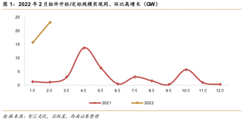 除同比爆發(fā)式增長(zhǎng)外,如若著眼于月度間變化,我們認(rèn)為2月需求表現(xiàn)持續(xù)向好。從總量來(lái)看,2月開(kāi)標(biāo)/定標(biāo)規(guī)模達(dá)23.2GW,環(huán)比增長(zhǎng)47.3%;從單項(xiàng)目規(guī)模上看,華電集團(tuán)15GW組件集采大單具有較強(qiáng)代表性。