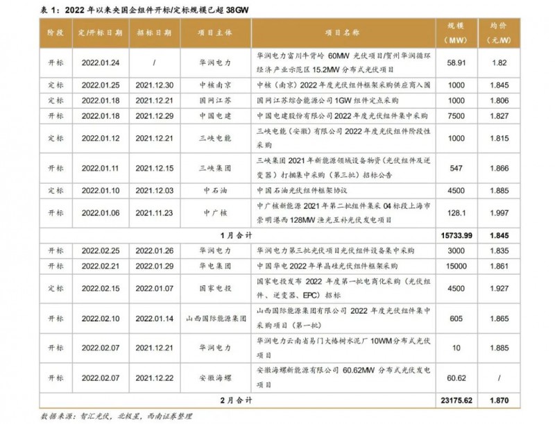 地面電站裝機(jī)需求釋放,央國(guó)企組件開(kāi)標(biāo)熱潮開(kāi)啟。2021年12月上旬硅片庫(kù)存去化、產(chǎn)業(yè)鏈價(jià)格回落,地面電站的組件招標(biāo)逐步啟動(dòng);疊加部分項(xiàng)目延期、補(bǔ)裝組件等因素,2022開(kāi)年來(lái)終端需求呈現(xiàn)爆發(fā)式增長(zhǎng)。根據(jù)我們統(tǒng)計(jì),2022年1-2月,以央國(guó)企為主的組件開(kāi)標(biāo)/定標(biāo)規(guī)模已達(dá)38.9GW??紤]到統(tǒng)計(jì)信息的不完全性,實(shí)際開(kāi)標(biāo)/定標(biāo)規(guī)模有望達(dá)到40GW,終端需求表現(xiàn)強(qiáng)勢(shì)。