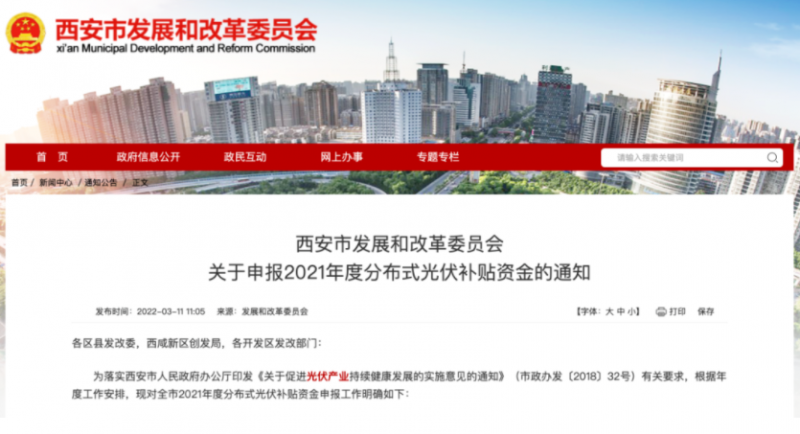 3月11日,陜西省西安市發(fā)改委發(fā)布關(guān)于申報2021年度分布式光伏補貼資金的通知。