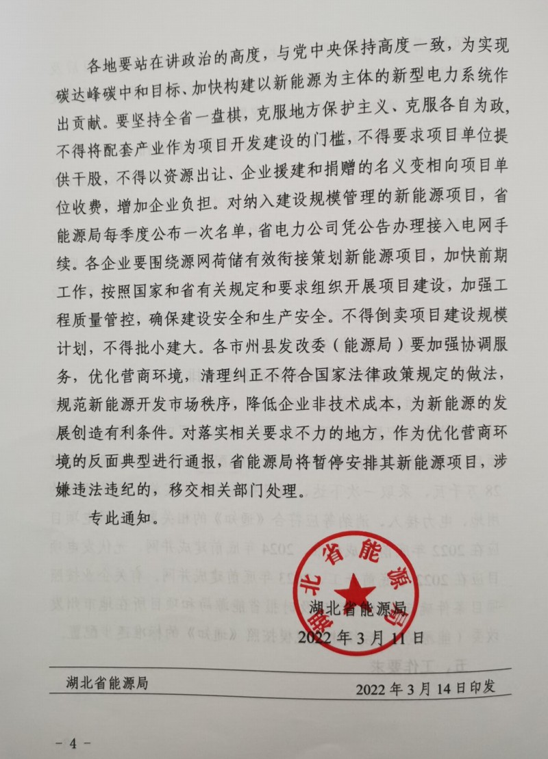 3月14日,湖北省能源局下發(fā)《關(guān)于落實相關(guān)政策推進(jìn)風(fēng)電、 光伏發(fā)電開發(fā)建設(shè)有關(guān)事項的通知》。文件給予四類新能源項目指標(biāo),總規(guī)模738萬千瓦,包括: