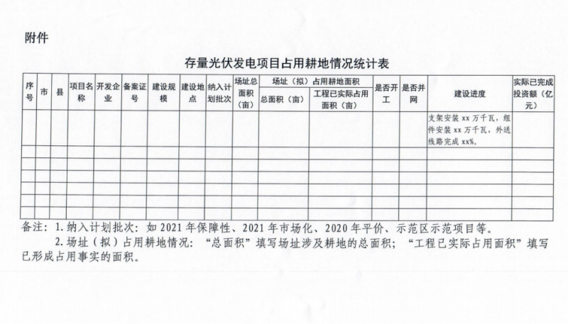 3月11日,河北省能源局啟動存量光伏電站占用耕地摸底統(tǒng)計工作,文件要求對照自然資源部門土地年度變更調(diào)查數(shù)據(jù)庫,對已列入省年度計劃、尚未辦理建設(shè)用地審批手續(xù)的存量光伏發(fā)電項目占用耕地情況進行摸底統(tǒng)計。附表信息統(tǒng)計中包括項目名稱、開發(fā)企業(yè)、備案證號、建設(shè)規(guī)模及地點、納入計劃批次以及場址總面積、已占用面積以及建設(shè)進度等多項詳細信息。