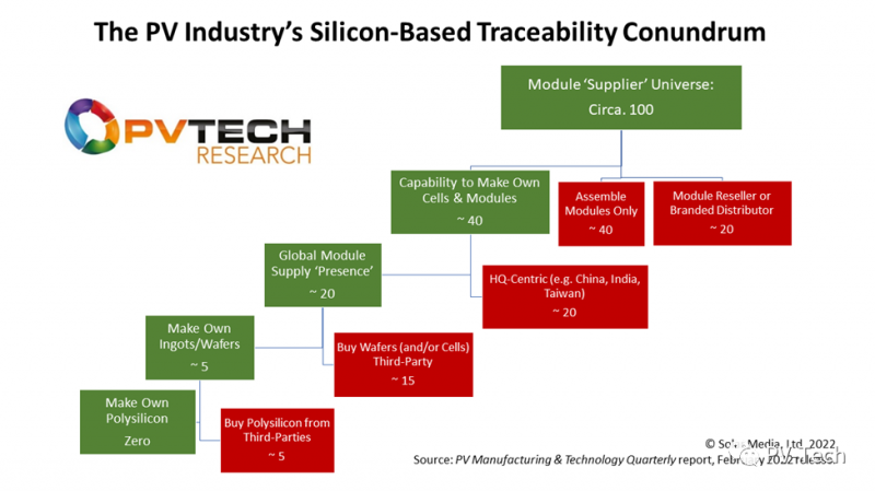 讓我們從目前全球約100家光伏組件供應(yīng)商開始,為什么它們中的大多數(shù)對其上游供應(yīng)鏈、技術(shù)路線圖和物料清單幾乎沒有控制。筆者試圖在下面的流程圖中形象的說明這一點(diǎn)。