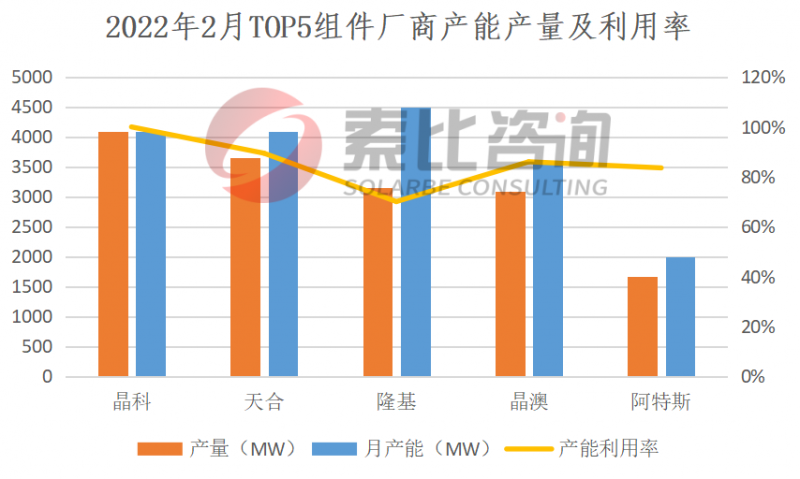 2022年2月,海內(nèi)外市場組件需求旺盛,國內(nèi)組件產(chǎn)量25.5GW,環(huán)比大增22.63%。一方面,國內(nèi)部分地面電站項目補裝、央國企組件開標規(guī)模近40GW,一方面,印度即將實施新的關(guān)稅政策引發(fā)搶裝。按照產(chǎn)量排名,晶科、天合、隆基、晶澳、阿特斯位列前五,企業(yè)總產(chǎn)量15.63GW,占比61.29%,綜合開工率85.75%。預(yù)計2022年3月,組件需求和排產(chǎn)基本維持2月水平,國內(nèi)電站補裝及印度搶裝效應(yīng)逐步淡化。