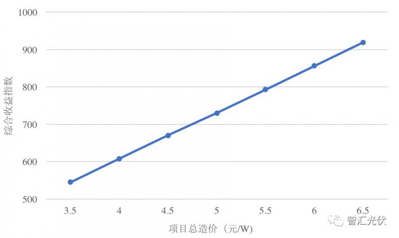 當(dāng)初始投資為4元/W時,綜合收益指數(shù)(發(fā)電小時數(shù)×上網(wǎng)電價)達(dá)到610時,項(xiàng)目內(nèi)部收益率即可達(dá)到基準(zhǔn)收益率8%。