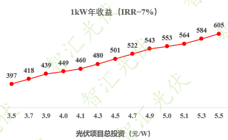 假設(shè)山東某地光伏項(xiàng)目,首年滿發(fā)小時數(shù)為1350小時,山東的脫硫煤電價電價為0.3949元/kWh;該項(xiàng)目1kW年收益 = 1350*0.3949=533根據(jù)上表,533應(yīng)該介于總投資4.7元/W與4.9元/W之間。因此,項(xiàng)目總投資要控制在4.8元/W以內(nèi)時,該項(xiàng)目全投資內(nèi)部收益率可以達(dá)到7%以上。假設(shè)內(nèi)蒙古蒙西某地光伏項(xiàng)目,首年滿發(fā)小時數(shù)為1700小時,蒙西的脫硫煤電價電價為0.2829元/kWh;該項(xiàng)目1kW年收益 = 1700*0.2829=481根據(jù)上表,481對應(yīng)的總投資為4.3元/W。因此,項(xiàng)目總投資要控制在4.3元/W以內(nèi)時,該項(xiàng)目全投資內(nèi)部收益率可以達(dá)到7%以上。如果所在企業(yè)收益率標(biāo)準(zhǔn)不是7%,而是6.5%,用同樣的方法,也可以計算出“1kW年收益”的對應(yīng)數(shù)值。