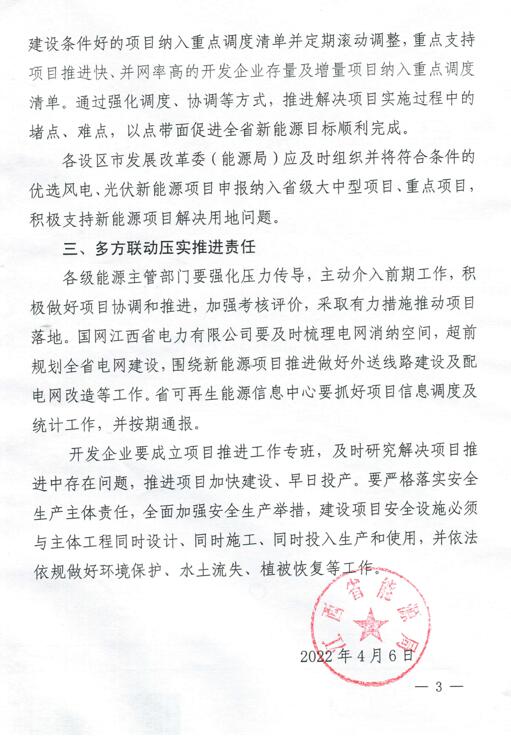2022年4月6日,江西省能源局就加快我省新能源項目建設有關(guān)事項進行了通知,通知包含以下內(nèi)容:1.加快推進新能源項目建設;2.建立重點項目調(diào)度機制;3.多方聯(lián)動壓實推進責任。