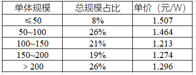1)項目規(guī)模影響并非單體規(guī)模越大成本越低,單體規(guī)模在100~150MW的項目,是目前成本最低的。不同規(guī)模的光伏項目小EPC平均價格差異最高可達(dá)0.25元/W。