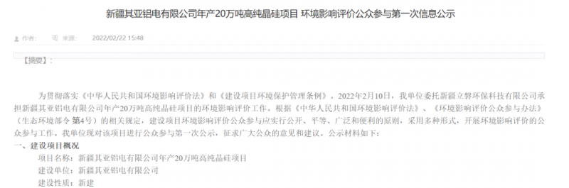 項(xiàng)目名稱:新疆其亞鋁電有限公司年產(chǎn)20萬(wàn)噸高純晶硅項(xiàng)目