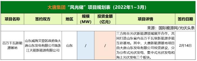 截至2022年3月31日,大唐集團共簽約(規(guī)劃)1個風(fēng)光儲項目,該項目只簽署了合作協(xié)議。