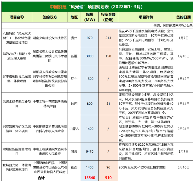 截至2022年3月31日,國家能源集團共簽約(規(guī)劃)5個風(fēng)光儲項目,明確項目規(guī)模共計7.56GW。