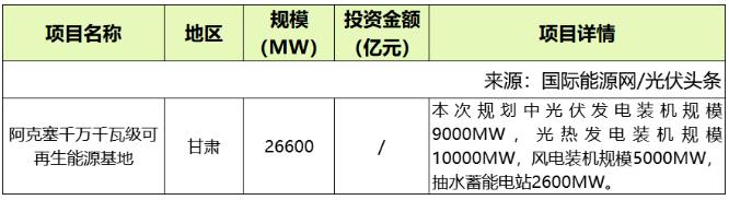 值得注意的是,甘肅酒泉市阿克塞哈薩克族自治縣人民政府發(fā)布文件顯示,阿克塞千萬千瓦級可再生能源基地規(guī)劃中光伏發(fā)電裝機規(guī)模9000MW,光熱發(fā)電裝機規(guī)模10000MW,風(fēng)電裝機規(guī)模5000MW,抽水蓄能電站2600MW,規(guī)模合計26.6GW。