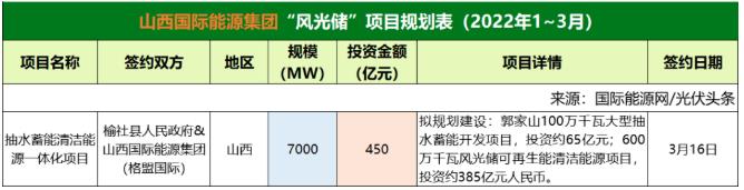 截至2022年3月31日,山西國際能源集團共簽約(規(guī)劃)1個風(fēng)光儲項目,項目規(guī)模為7000MW,投資金額450億元。