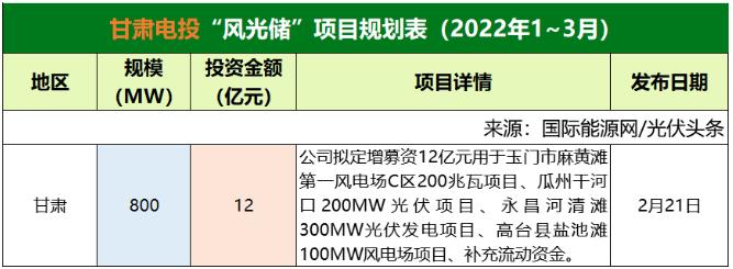 截至2022年3月31日,甘肅電投共規(guī)劃1個風(fēng)光儲項目,項目規(guī)模為800MW,投資金額12億元。